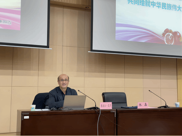 吾满江·艾力校长“从团结之源:深刻把握中华民族多元一体的基本国情;变化之巨:全面认识民族团结进步事业的伟大成就;长远之治:推动新时代党的民族工作高质量发展”等三个方面,结合准确而详实的数据,真实而鲜活的图文事例,以及自己的亲身经历和切身感受,讲述了近些年来新疆建设所取得的伟大成就,阐释了铸牢中华民族共同体意识概念的提出及其内涵,引导并要求广大同学要争做民族团结的忠实践行者。吾满江·艾力校长强调,铸牢中华民族共同体意识是促进民族团结的必然要求,是实现中华民族伟大复兴的必然要求,也是维护各族人民利益的必然要求。他勉励全体青年学子要传承红色文化,增强“五个认同”,把智慧和力量凝聚到促进民族团结,共建美好家园上来。要增强感恩意识,感恩党、感恩人民、感恩国家。要牢固树立休戚与共、荣辱与共、生死与共、命运与共的共同体概念,增强国家意识、公民意识、法治意识。要“像爱护自己的眼睛一样爱护民族团结,像珍视自己的生命一样珍视民族团结,像石榴籽那样紧紧抱在一起”。