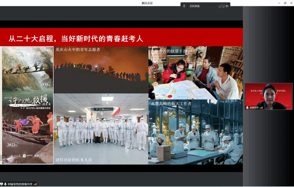 分团委书记、辅导员阿丽菲热·阿布来提作了题为《请党放心,强国有我——学习领会党的二十大精神》的专题讲座,通过模块化讲解二十大报告,重点剖析二十大对青年的勉励。倡导当代青年、尤其是积极向党组织靠拢的先进分子,与我们伟大的历史进程同生共长、同向同行,完成时代赋予我们的光荣使命。