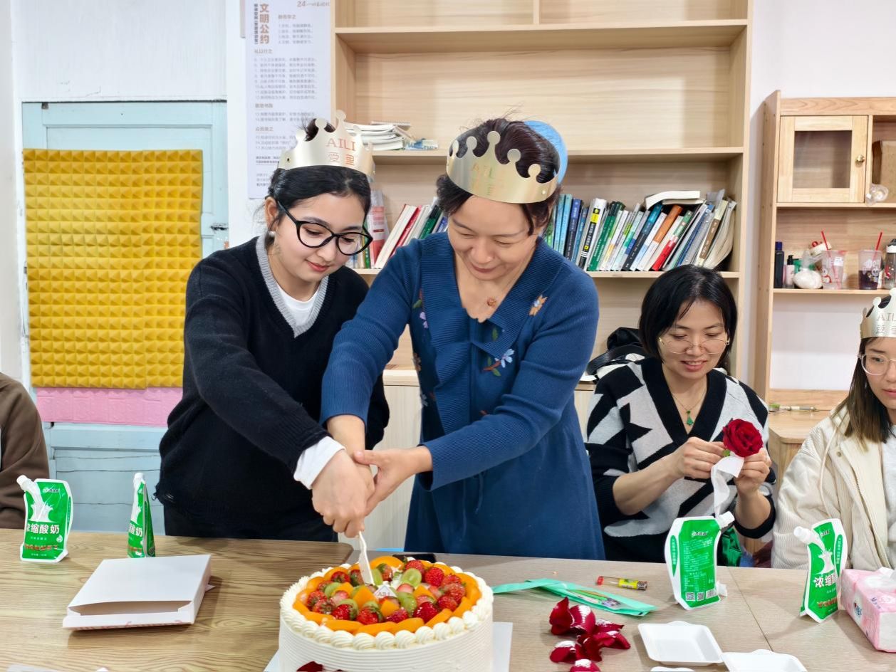 李桂新副院长与穆妮热同学一同切生日蛋糕,切开的是蛋糕,分享的师生间是最真挚的祝福和最温暖的情谊。在轻松愉快的聊天环节中,现场欢声笑语不断,气氛温馨而融洽。