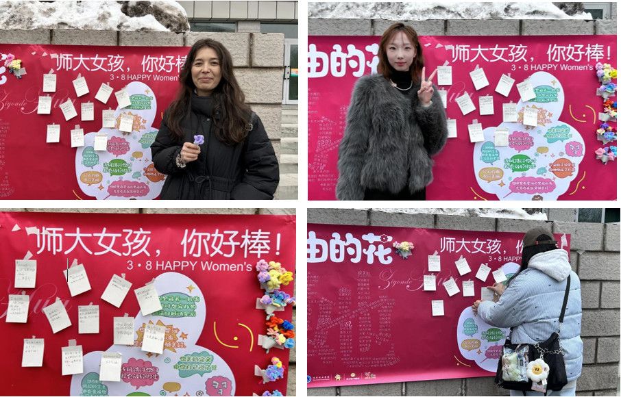 “师大女生,你好棒” 打卡展板也备受欢迎。以 3·8 国际劳动妇女节为主题精心设计的展板,充满了节日氛围。展板上匠心独运地布置了20余条暖心标语,诸如“做自己,光芒不只在今日闪耀”“为生活悦己,绽放自我”等。同学们被这些充满力量的话语吸引,纷纷在展板前拍照打卡。大家挑选着契合自己心境的标语,自信地摆出各种姿势,用相机定格下这些美好的瞬间。现场洋溢着欢声笑语,同学们在展板前的笑容如阳光般灿烂,尽情展现着青春的蓬勃活力与坚定自信。