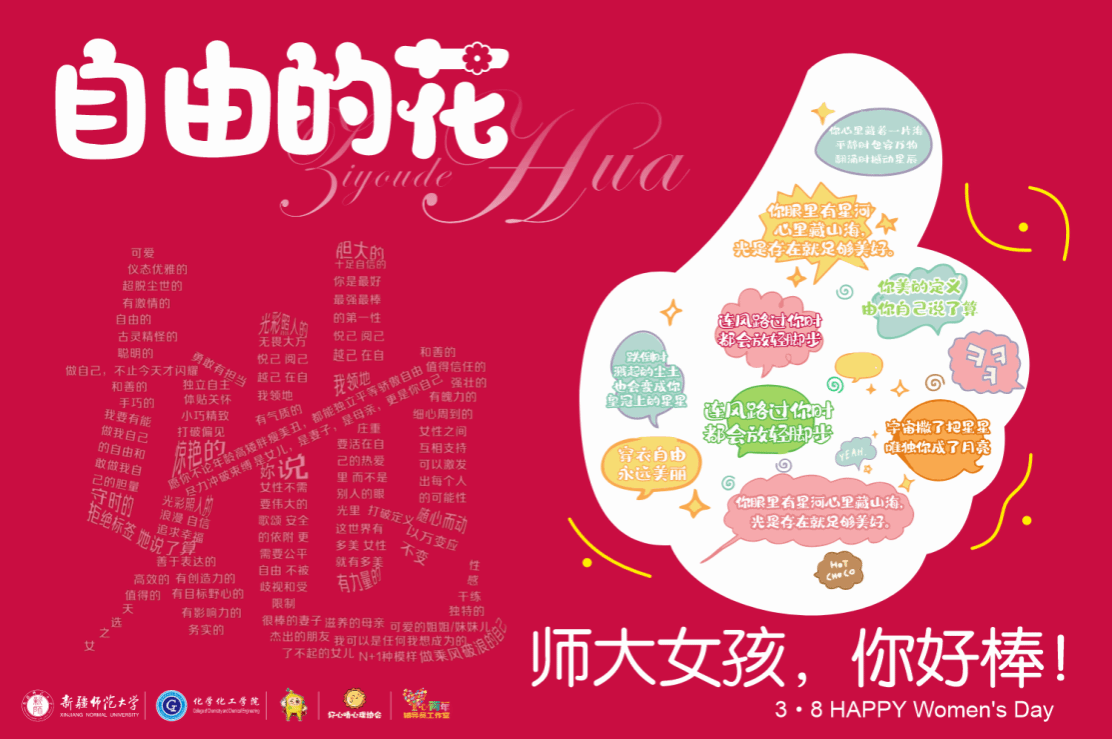 在春风轻拂、万物复苏的美好时节,为迎接 “3・8 国际劳动妇女节”,新疆师范大学心青年辅导员办公室携手好心晴心理协会于2025年 3 月 7 日 - 3 月 8 日下午 16:00 在教学主楼前开展了 “自在的‘花’” 主题活动。此次活动意在助学生挣脱标签枷锁,增强自我认同,促进沟通分享,优化心理状态,营造温馨氛围,为心理成长添翼。活动现场氛围热烈,亮点纷呈。