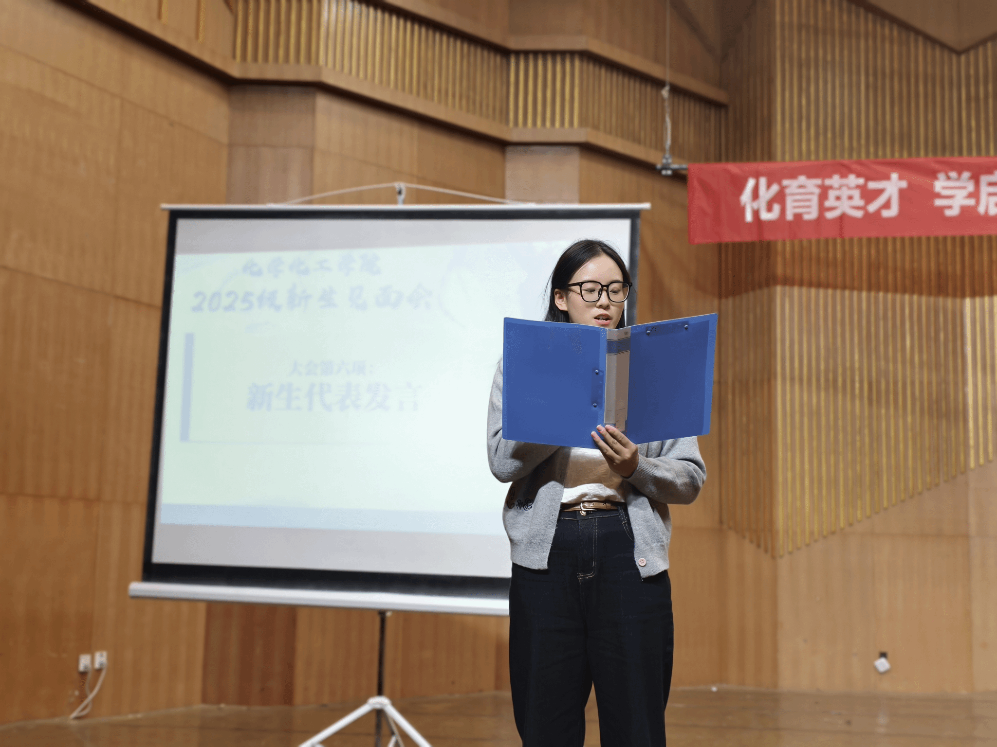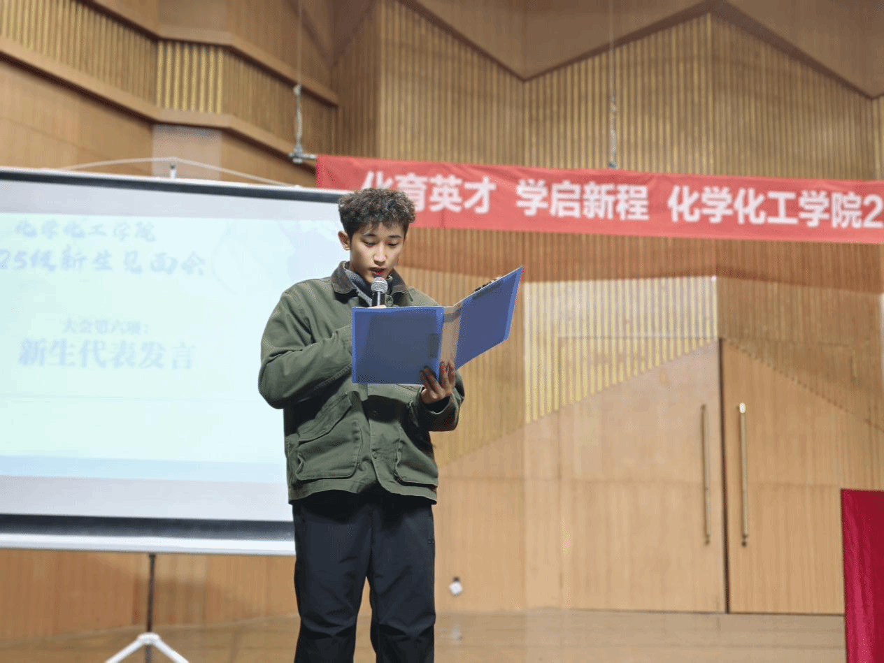环境工程25-7班蒋勤勤、化学25-3班阿依巴特尔两位同学作为新生代表发言。他们或憧憬“化笔为剑,破解科研谜题”,或立志“以梦为马,在化院沃土深耕”,字字句句都是青春的宣言,是“后浪”奔涌的蓬勃力量。