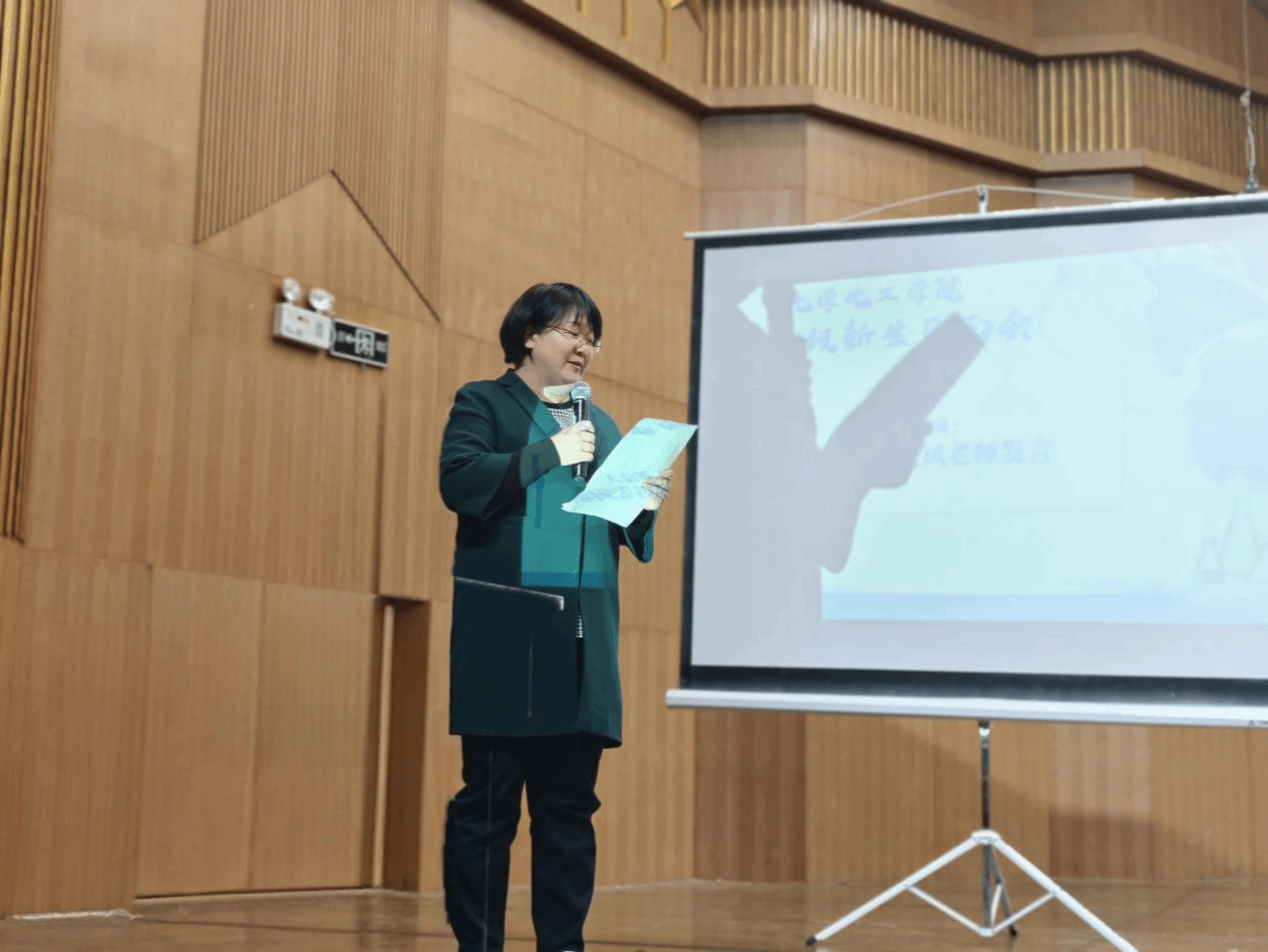化学25-1班班主任谷晓凤老师登台作代表发言:她阐述开学以来,以“同行者”身份,分享观察到同学们情况各异,但一切向好。并期勉大家:一要做“现实理想主义者”,明确目标并拆解践行;二要练真本事,将创意转化为行动力;三要修强心脏,以挫折为成长路标。她表示愿做大家后盾,盼携手在化院活出青春厚度。