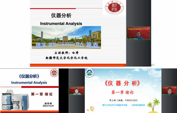 的胡存明老师,他首先带领学生回顾分析化学相关的内容,引出了仪器分析的定义,重点讲解了仪器分析的应用,如,在食品安全方面,以三聚氰胺事件的实例引人深思,在药物分析方面,引用了止痛药成分的案例,在生命科学方面播放了介绍新型冠状病毒的视频,注重理论与实际相结合;此外,详细介绍了仪器分析的发展史,引发学生对科学探索的向往。最后一位分享的是喀什大学的贺小刚老师,一开篇便以卢佩章院士的科学家精神融入课程思政,与教学内容自然衔接,并介绍了课程的基本情况,向学生推荐了丰富的课程学习资源,明确了课程的学习目标,随后向学生展示4张图开启了本节内容的学习,对比讲解了化学分析和仪器分析的区别联系,通过阐述各自的应用场景概括出了仪器分析的概念,同时也向学生详细介绍了仪器分析方法的分类,在此基础上讲解了化学分析与仪器分析的优缺点。