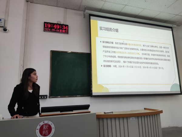 2021级化学工程与工艺专业9名同学进行了汇报。在新疆分析测试研究院进行实习的祖丽胡玛尔·麦合同学说,在实习期间深入了解了分析测试领域前沿技术,参与了多个实验项目,提升了自己的实验技能和数据分析能力。同时,与团队成员的合作也让自己学会了沟通与协作的重要性。通过这次实习,更加明确了自己未来的职业方向,为今后的发展奠定了坚实的基础。在国检测试集团京诚检测有限公司实习的薛龙缘同学说,本次化工专业实习是一次宝贵的学习和实践经历。通过实习不仅提升了自己的专业技能和素质,还增强了社会责任感和团队协作精神,在未来的学习和工作中将继续发扬这种精神,不断提高自己的综合素质和能力,为化工事业的发展和社会的进步贡献自己的力量。在实习期间参加全国大学生化工设计竞赛的李超同学说,通过参与化工设计大赛,自己加深了对专业知识的理解,提高了自身学习能力和应变能力,带领团队获得了全国大学生化工设计竞赛全国二等奖的优异成绩。而且,自己也明白了一个团队的成功离不开每个成员的努力,在未来的生活中将继续发扬合作精神,让自己在未来的化工事业中发光发热。在实习期间参加全国大学生化工实验技能大赛的宋相飞同学说,在这三个月里经历了一段充实而富有挑战的时光。这段时光不仅让我深入学习了化工实验的相关知识和技能,更让我有机会代表学校参加大赛并荣获了西北赛区一等奖。此次经历让自己更加深刻地认识到学习和实践是相辅相成的。只有通过不断学习,才能不断提升自己的专业素养;只有通过实践,才能将所学知识转化为实际能力。在比赛中,我们团队成员之间相互支持、相互鼓励,共同面对挑战,最终取得了优异的成绩。史妍洁同学说,回顾这段实习经历,我深感自己在化工领域的知识和技能得到了极大的提升。从理论学习到实验操作,从团队协作到个人能力的锻炼,每一个环节都让我收获颇丰。我相信,在未来的职业生涯中,这段宝贵的经历将一直激励着我不断前进,我将带着这段宝贵的经验,勇敢地继续探索化工领域的无限可能。