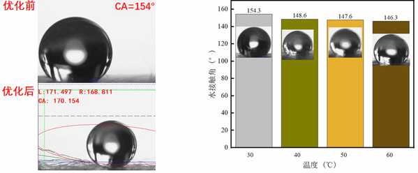 吾满江研究团队采用自制的高分子硅氧烷材料(即将申报专利),与棉花纤维进行室温下的浸泡,实现了棉花纤维的改性。初步改性后棉团水接触角>151°,接触角滞后<3°,经过优化反应条件后的改性棉纤维的接触角达到了171°,呈现出优异的超疏水特性。该超疏水材料能够耐受较大的拉伸形变,在80%拉伸形变下水接触角仍高于171°,接触角滞后<3°,而且循环拉伸1000次其疏水性能基本保持不变。该材料对河水、海水以及酸碱溶液都呈现优异的超疏水性能,甚至在UV曝光240h接触角133°后其疏水性能仍能较好的保持;应用范围广、性能稳定性好(等数据进一步完善过后申报专利)。