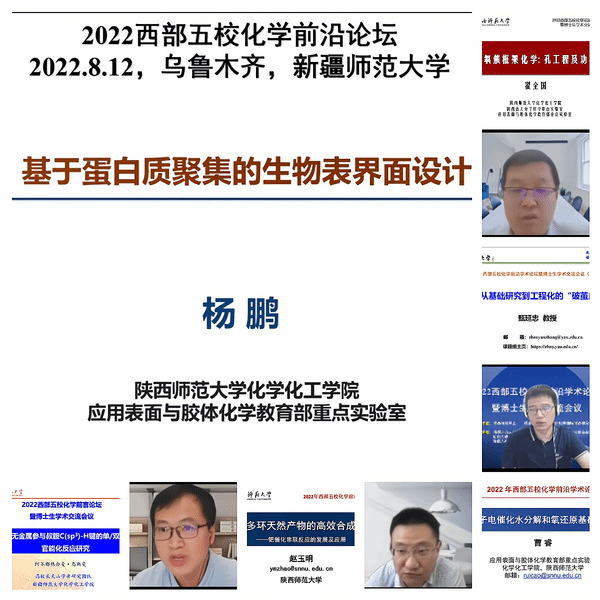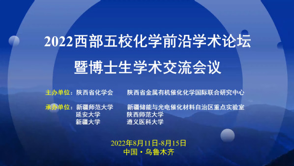 为进一步推动我国西部高校化学相关学科的科学研究与科研合作,进一步提高西部高校博士生培养的质量和水平,更好发挥西部地区高校在丝绸之路核心区建设的重要科技支撑作用,8月11至15日,由陕西省化学会主办,我校承办的“2022西部五校化学前沿学术论坛暨博士生学术交流会议”在线上召开。来自新疆师范大学、延安大学、新疆大学、陕西师范大学、遵义医科大学等五所高校的11位化学前沿学科专家教授、12位博士生、300多位老师和研究生参加了本次学术交流会。