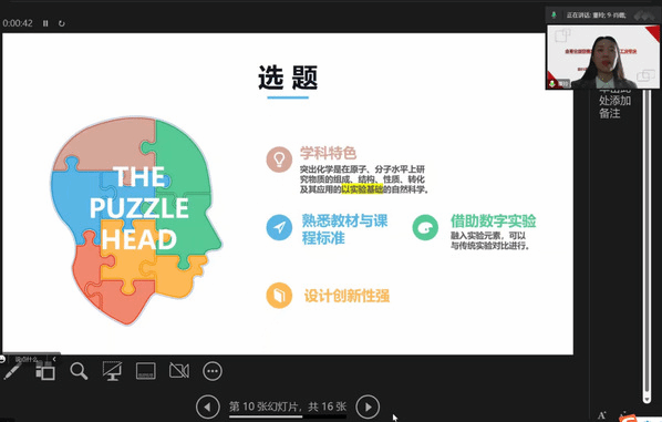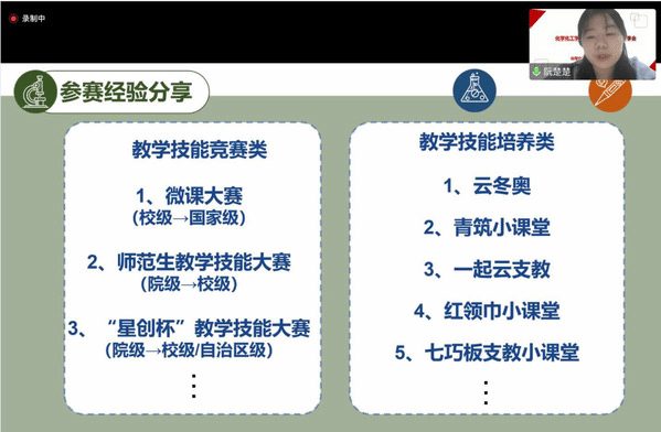 随后,化学与化学工程与工艺专业的4名同学为全院学生做经验分享。化学19-1班的徐作涛同学在“首届新疆师范院校师范生教学技能比赛”中学化学组的比赛中获得一等奖,他以教学技能大赛心得分享—初体验之孜孜不倦为师路为题,从教学设计、教学说课和片段教学为例为同学们详细介绍了在参赛过程中每一部分的规范要求及注意事项。化学19-2班的阮楚楚同学代表体育直播