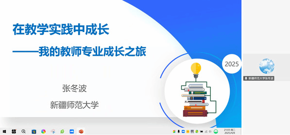 2025年4月8日晚,为更好地推进教研西行项目实施,赋能工作室和项目组成员教育教学能力提升,自治区天山英才关明名师工作室、《仪器分析智慧课程》新形态教研西行项目组召开“在教学实践中成长”主题会议。会议特邀全国优秀教师、自治区天山英才教学名师张冬波教授带来了关于教师职业发展的精彩分享,青海师范大学、喀什大学、伊犁师范大学、昌吉体育直播