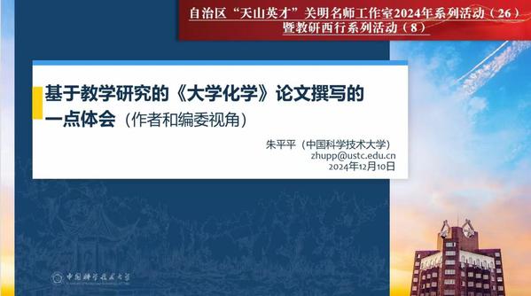 朱平平教授线上作题为“基于教学研究的《大学化学》论文撰写的一点体会(作者和编委视角)”的辅导报告。中国科学技术大学、湖南大学、山西大学、伊犁师范大学、喀什大学、新疆工程体育直播