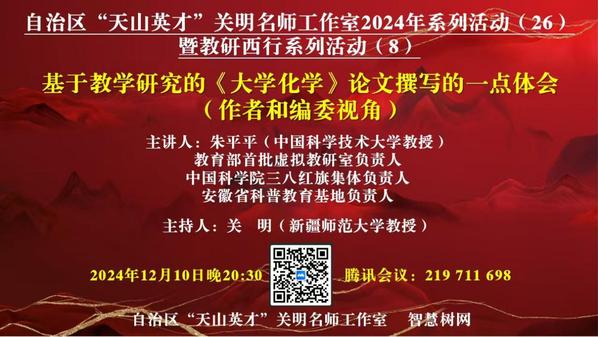 教学研究不仅是教师专业成长的重要引擎,更是推动教育教学质量提升的关键动力。优秀的教研成果通过论文发表、项目申报、研讨会等方式在更大范围内传播,不仅可以促使优质教学资源在高校内部甚至跨校之间共享,而且可以推动教学经验的交流与借鉴,提升高校整体教学质量。为提升教师教学研究能力与教研论文写作水平,助力青年教师专业成长与发展,推动专业成长和教学改革,促进教育教学质量的持续提升,2024 年 12 月10 日晚,自治区“天山英才”名师工作室、仪器分析智慧课程新形态教研西行项目组特邀中国科学技术大学化学与材料科学体育直播