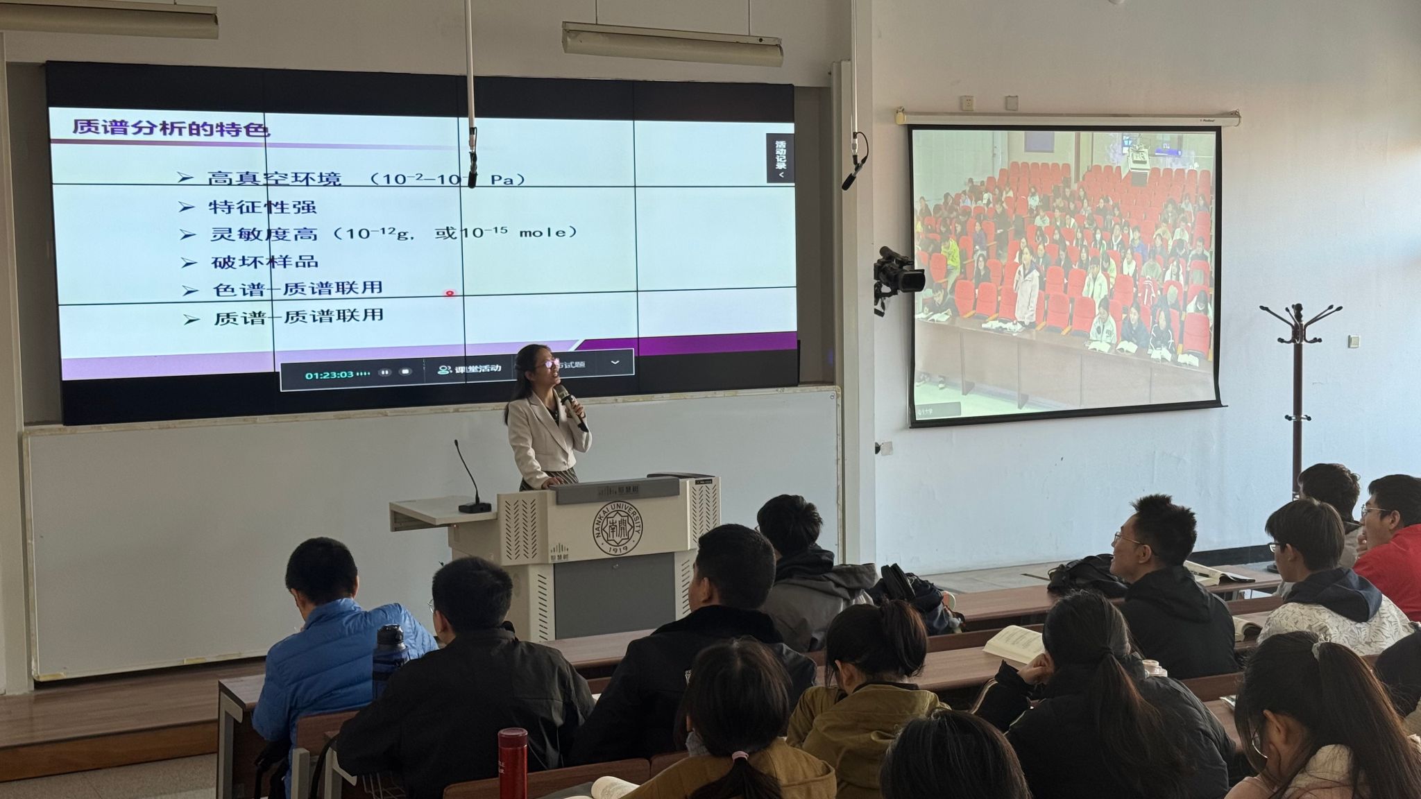 博士生导师王荷芳教授主讲“质谱分析法”,主课堂设在南开大学智慧教室。化学专业的200余名学生参加本次同步课堂,名师工作室成员、新疆师范大学仪器分析教学团队成员及喀什大学化学与环境科学体育直播