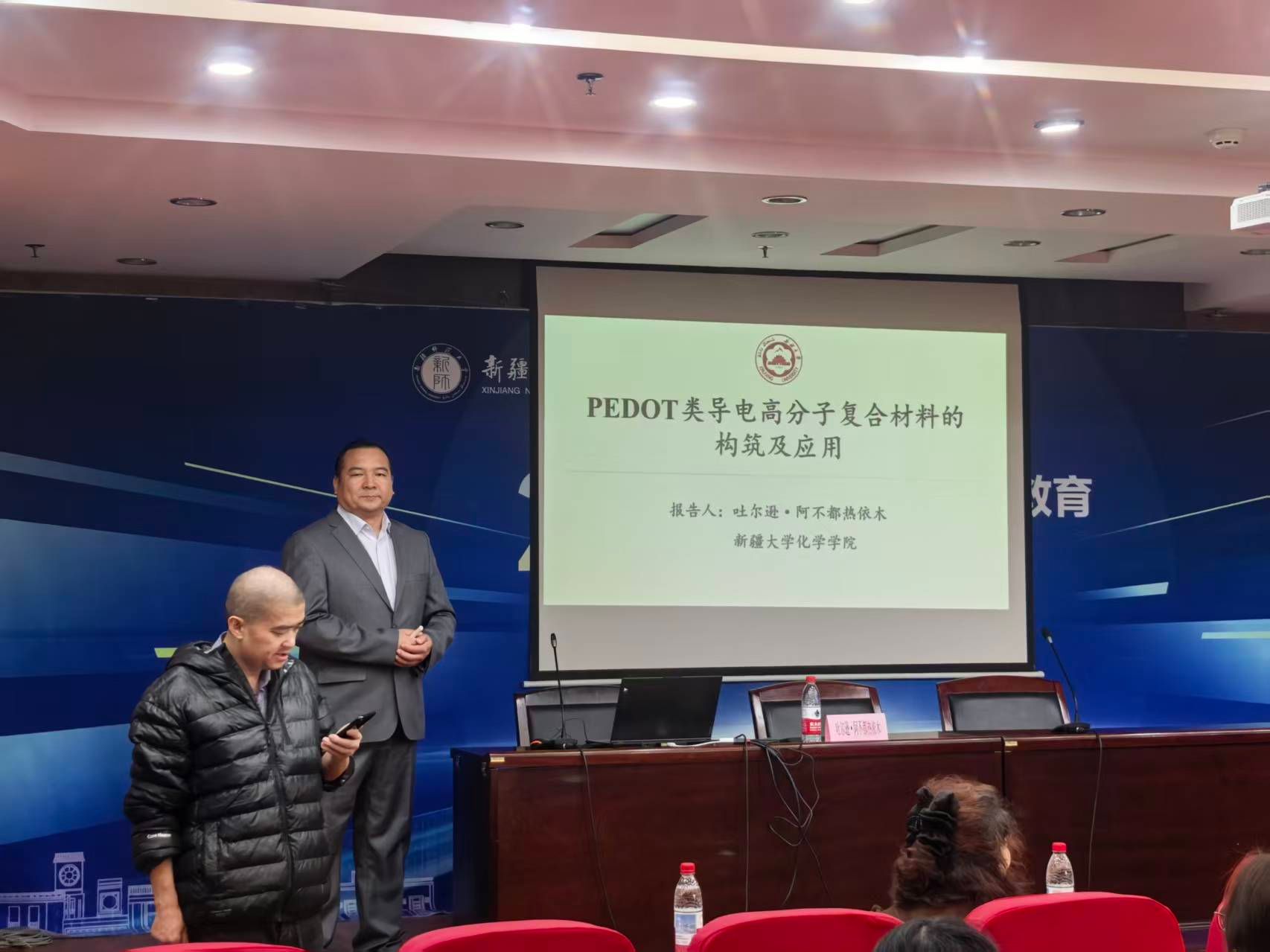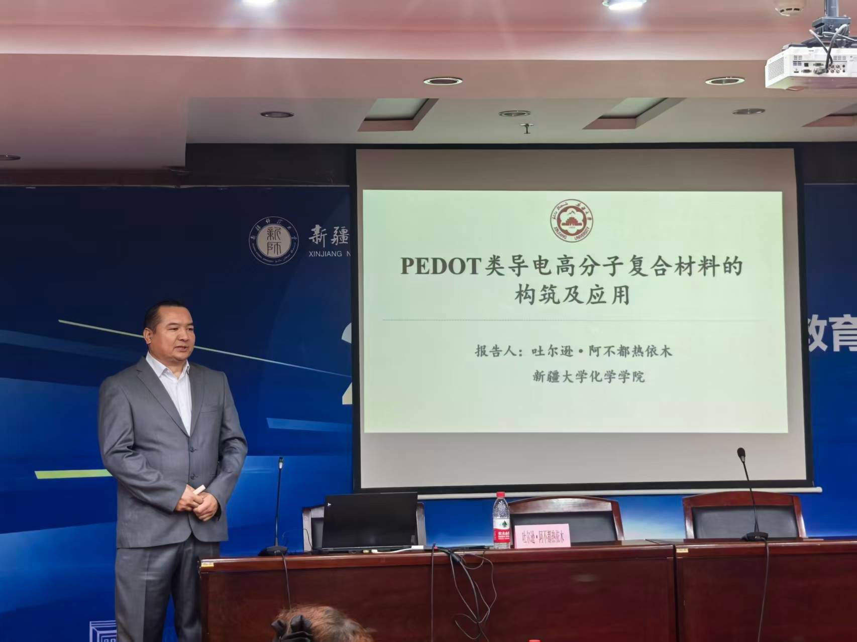 报告中,吐尔逊教授从导电聚合物的结构特性切入,系统介绍了PEDOT类导电高分子复合材料在能源、环境、传感等领域的应用研究。他重点阐述了PEDOT及其衍生物在紫外探测器、电化学传感器、超级电容器、直接甲醇燃料电池及CO₂电催化等方面的设计优化与性能提升。通过构建多元复合材料,有效提高了器件的灵敏度、选择性、能量密度和催化效率,展现了导电高分子在清洁能源转化与高灵敏检测中的广阔前景。研究还紧密结合新疆地区资源与产业需求,体现了材料研发服务于区域发展战略的定位。