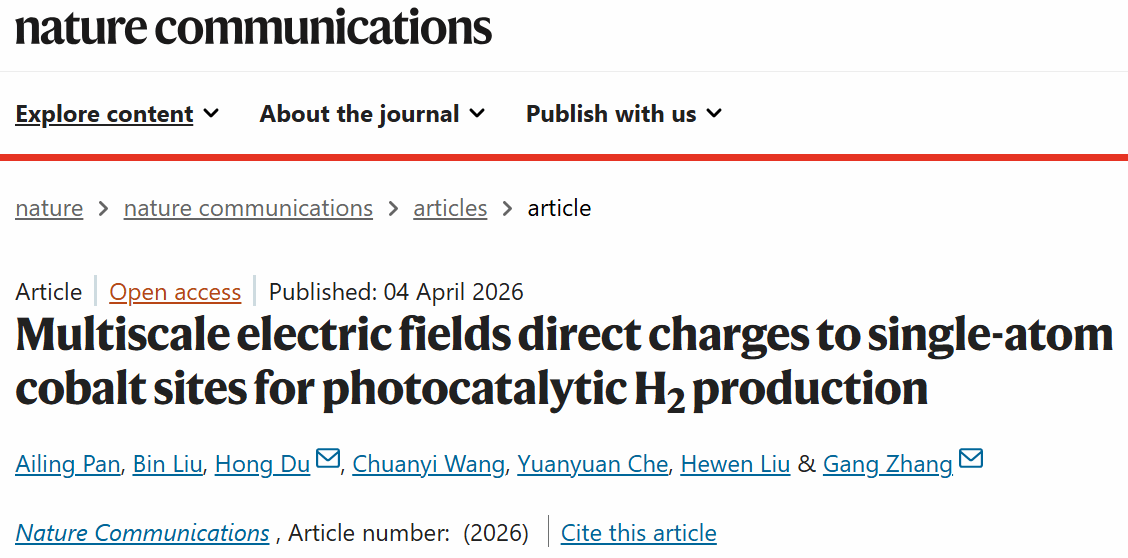 杜虹教授团队在学术期刊《Nature Communications》在线发表了题为“Multiscale electric fields direct charges to single-atom cobalt sites for photocatalytic H2 production”的学术论文。
